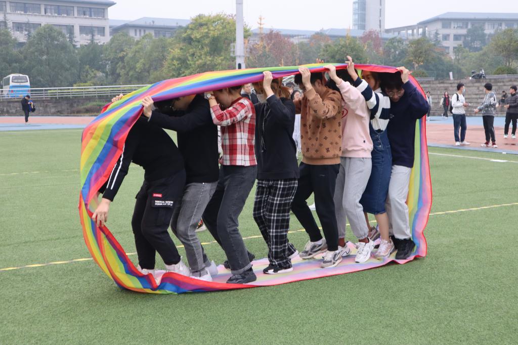 天公作美,微风习习,运动场上洋溢着青春和运动的气息,我院队员在正式比赛开始之前认真做了赛前训练,团队成员相互磨合,为正式比赛做了充分准备。第一个开始项目是“车轮滚滚”,参与此项目的同学身高相近,配合默契,裁判一声哨响后,“领头羊”张滔同学竭力推动布袋和把握队伍的前进方向,中间同学负责撑起布袋并稳步向前,末尾压阵蒋连宝同学发挥个人臂力优势,向前传递布袋。五彩斑斓的布袋映照着同学们齐心协力、奋勇向前的决心与毅力,最终我院同学以绝对的时间优势及零犯规的缜密行动,旗开得胜,赢得第一,激发了大家参与后续项目的斗志。